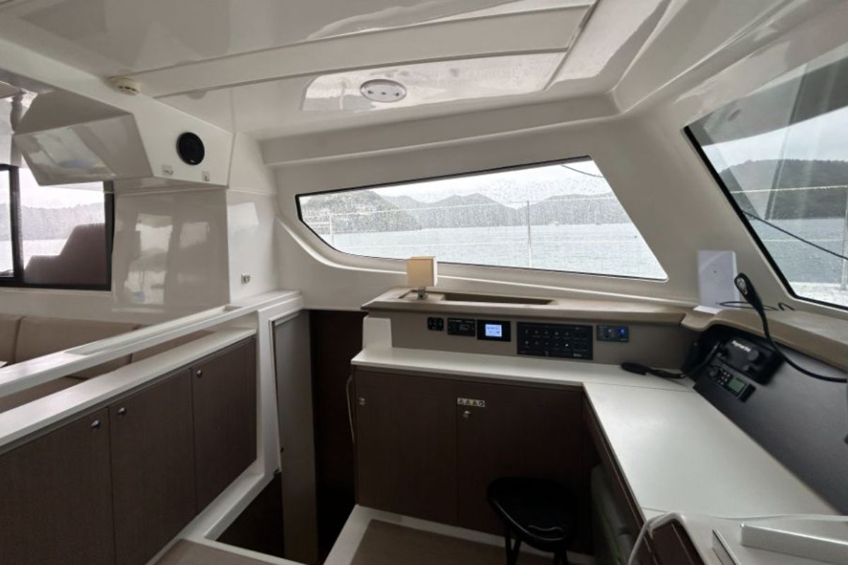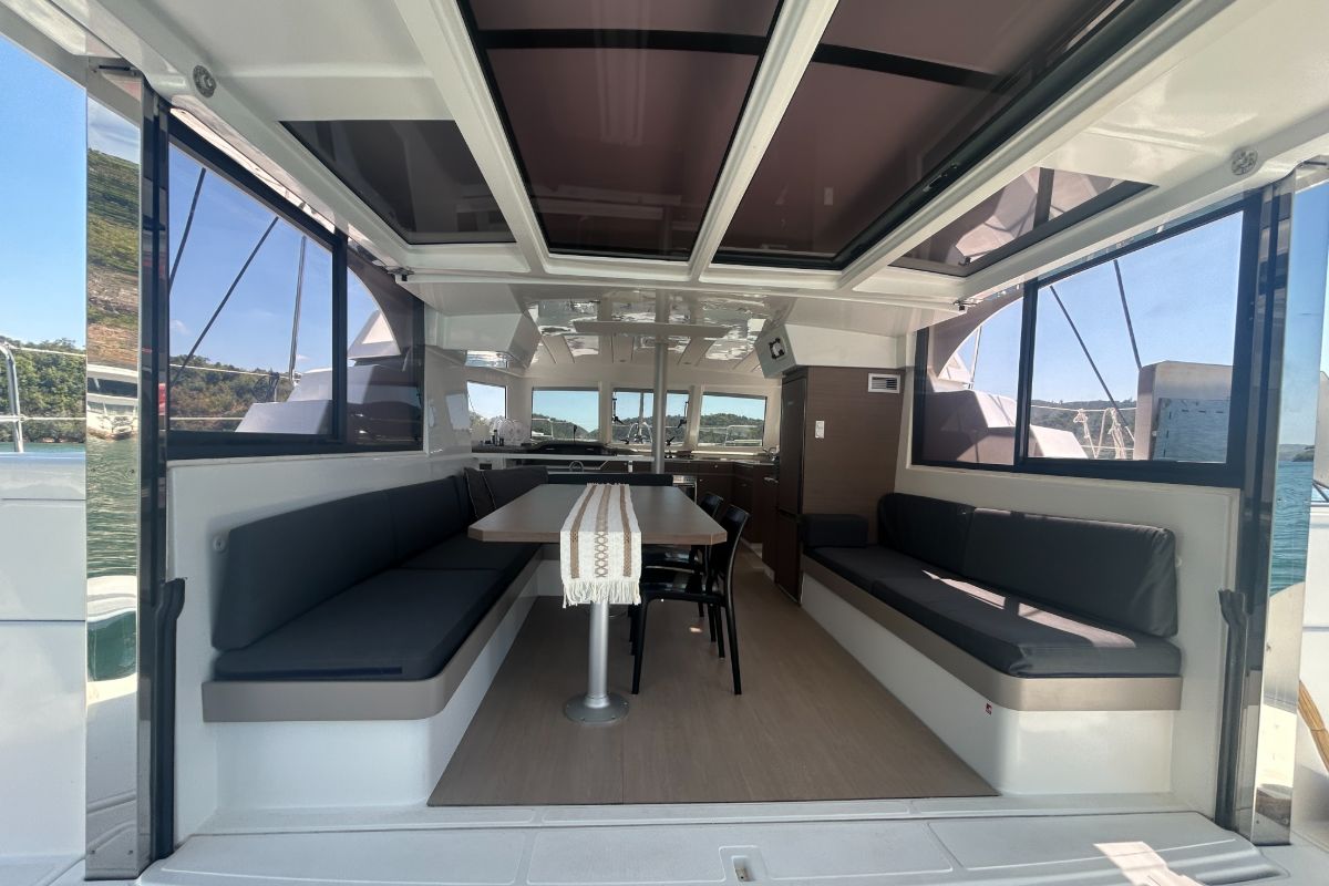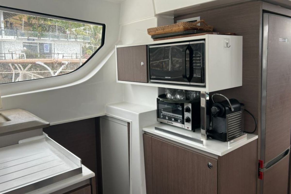 A bright, open saloon with panoramic view, comfortable seating, and a dining table. A fully equipped galley for gourmet meals, an ample counter space, and storage.