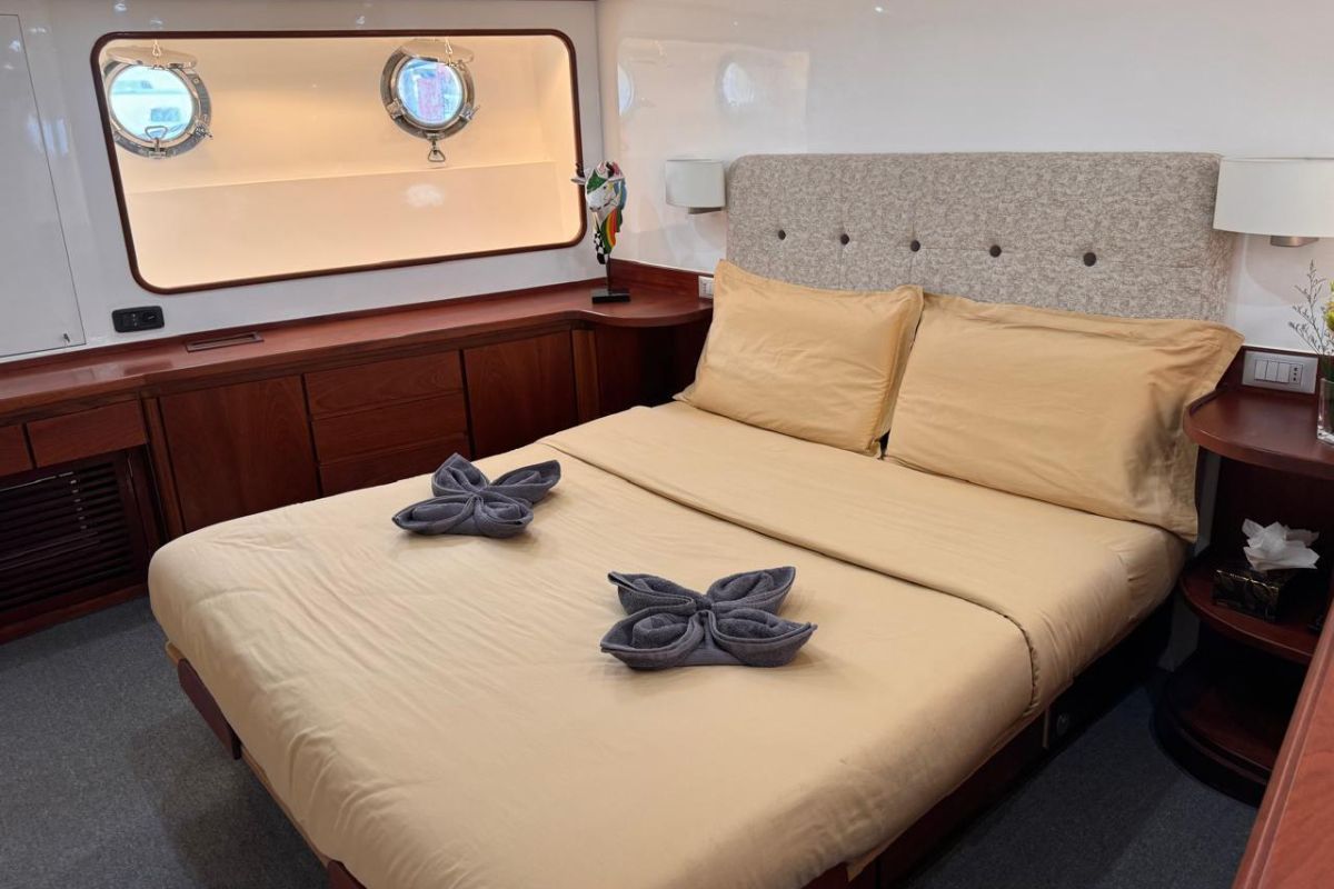 This yacht accommodates up to eight guests in four en-suite cabins: a generous master stateroom with a double bed and three twin-berth guest cabins, each with private bathrooms and televisions. Crew quarters for four are independently accessed, ensuring guest privacy. With multiple Palawan charter history and maintained by a dedicated full-time crew, this privately owned yacht is primed for bespoke adventures.