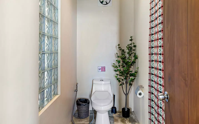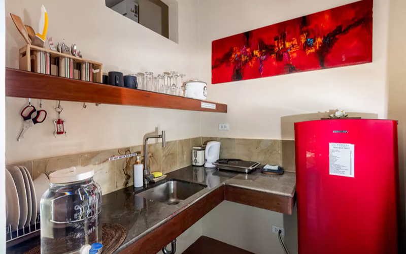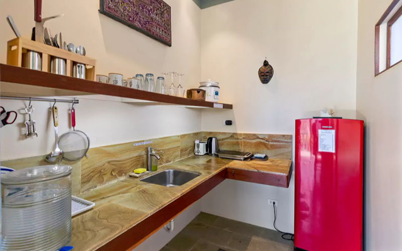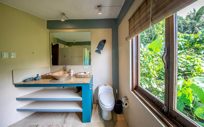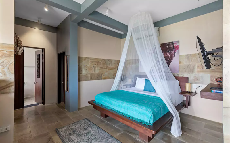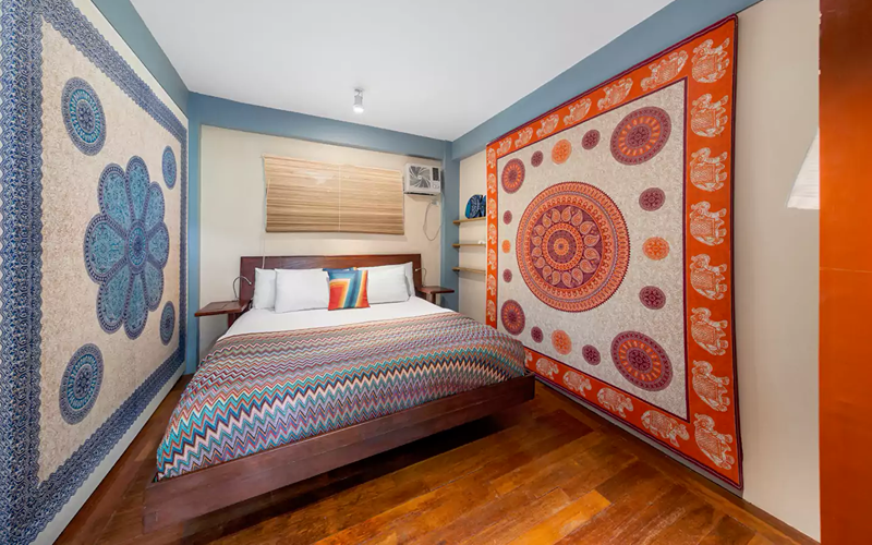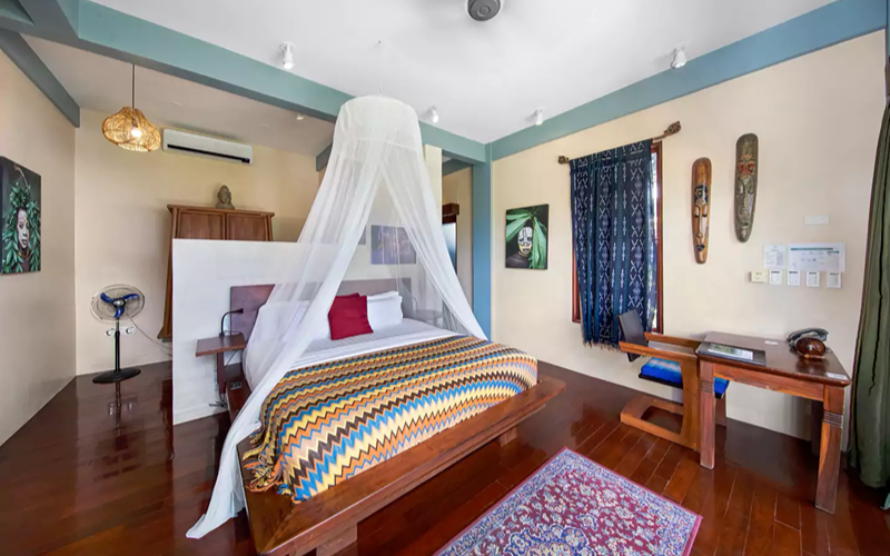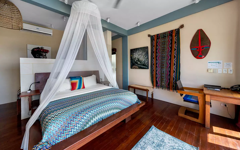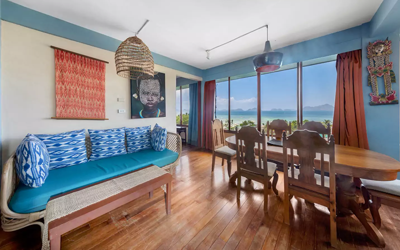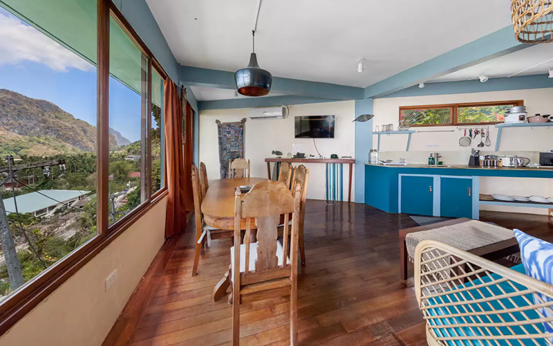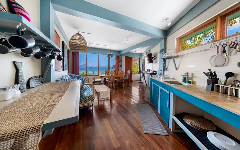 The Bohemian Apartment combines stylish Filipino-Boho interiors with functional space. It’s located above the reception, so more accessible compared to steep hillside units, yet still offering excellent views over the ocean through large windows. Rich colours, wooden floors, marble touches, and artworks give it unique character compared to more standard villas.