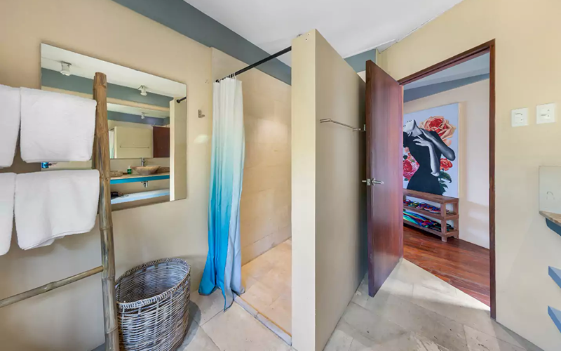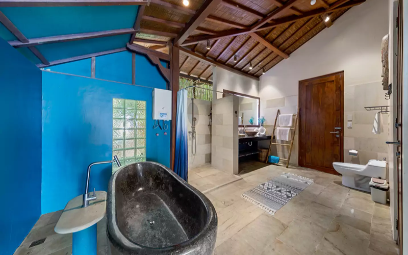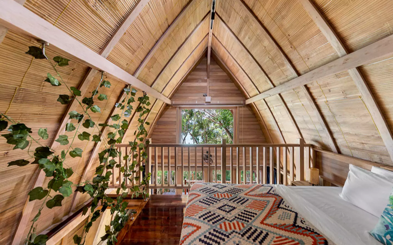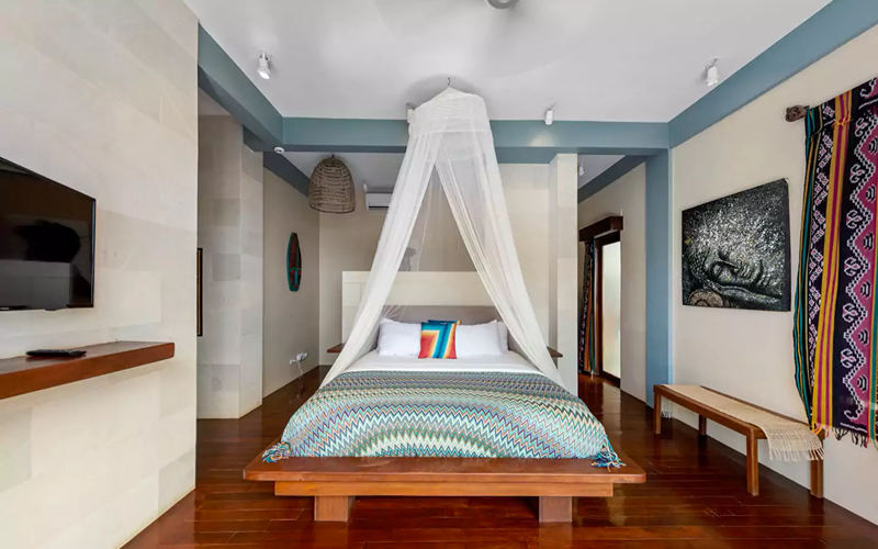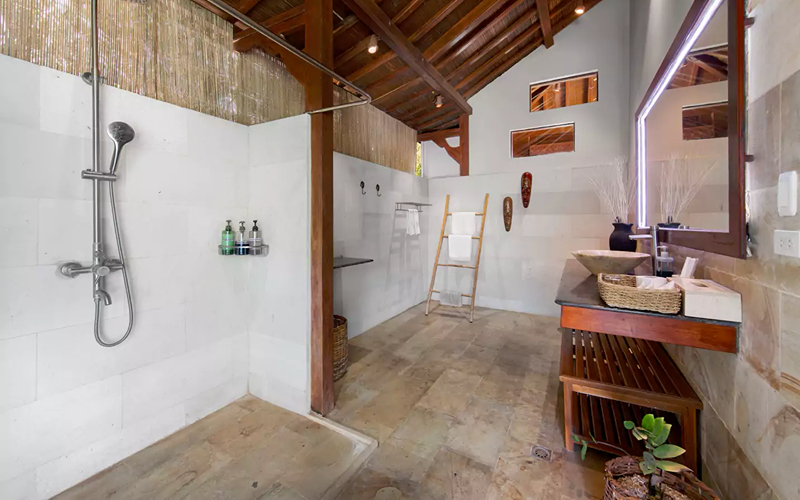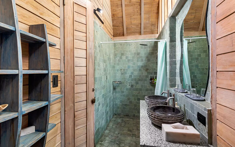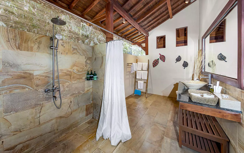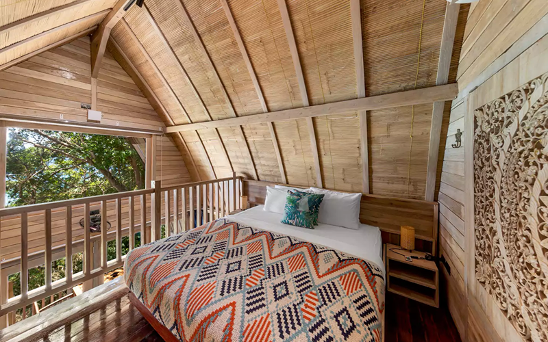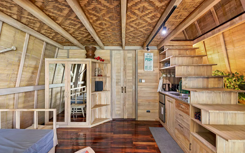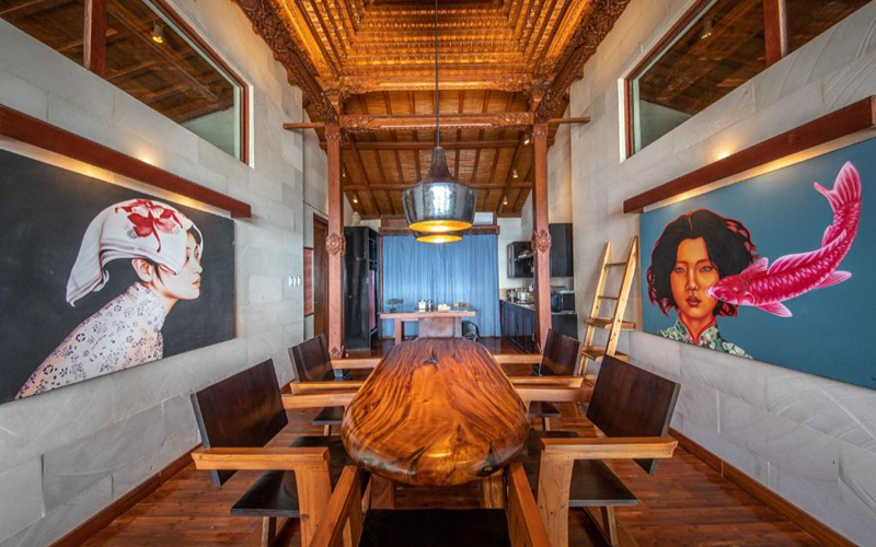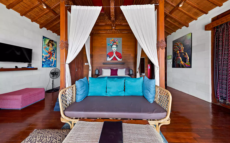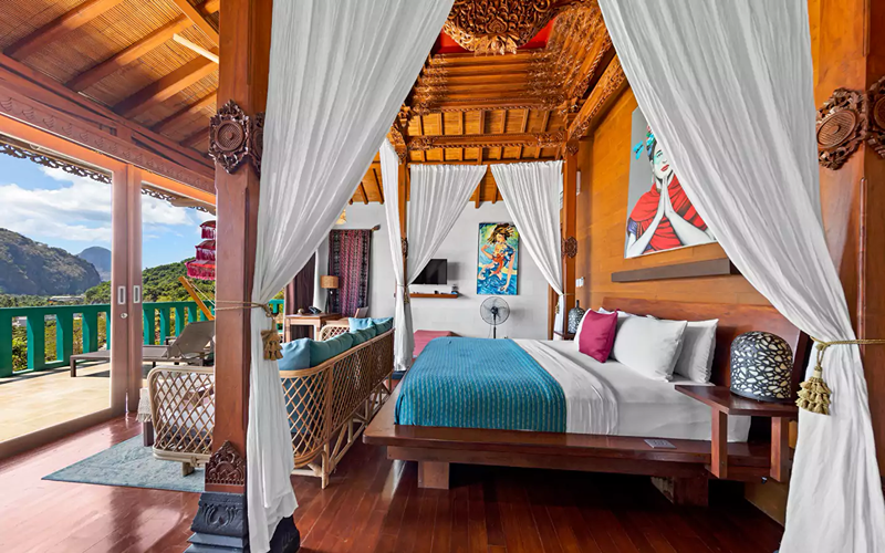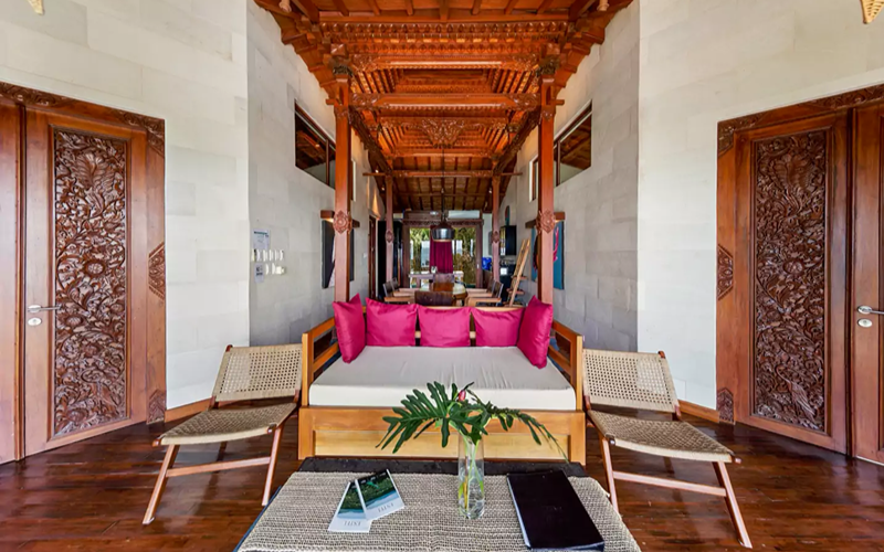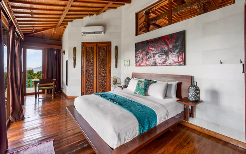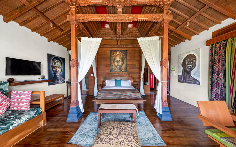 The Loft (Lumbung style) is a striking structure inspired by traditional Indonesian “lumbung” rice barns — curved roofs, teak and merbau wood, and an elevated position giving strong ocean views. Every piece of furniture tells a story, with some sourced from replica or antique wood in Indonesia.