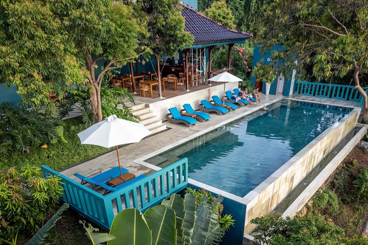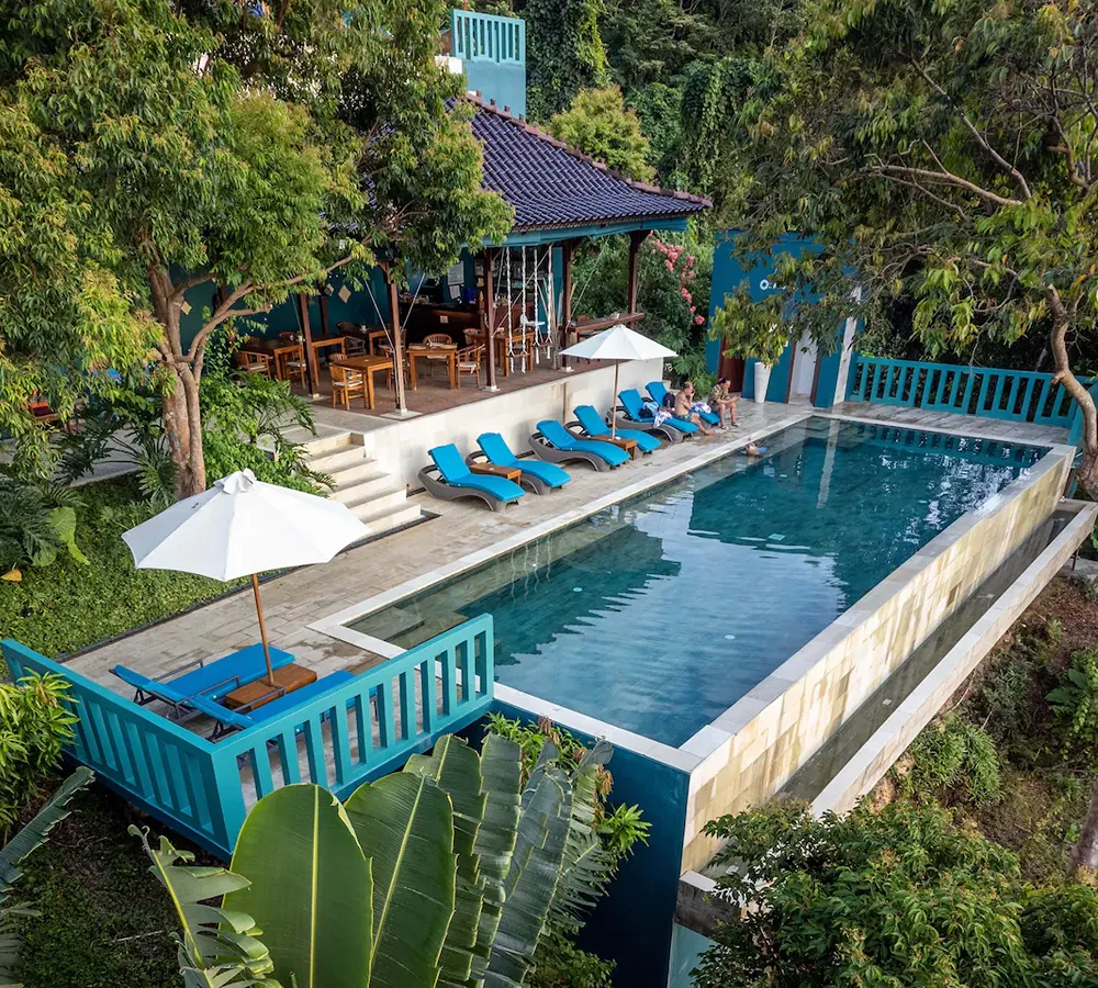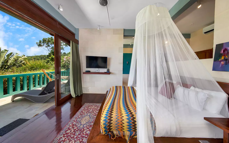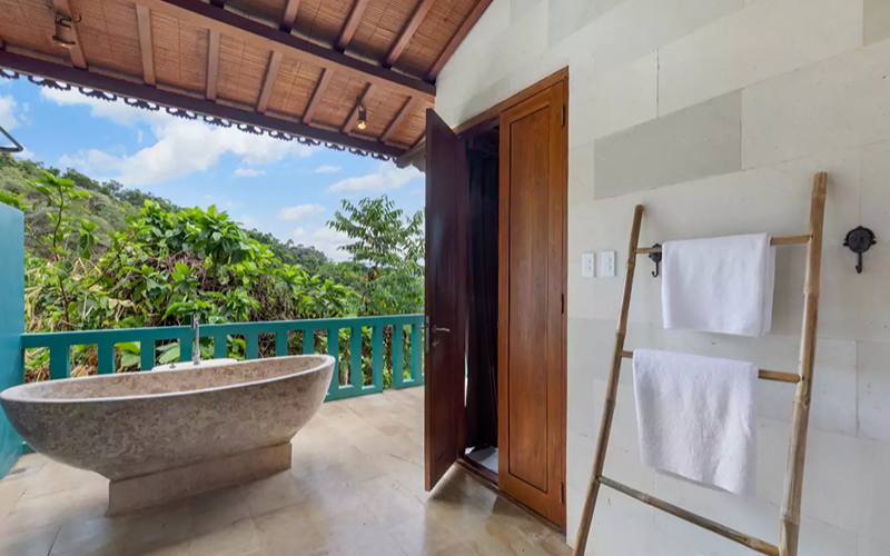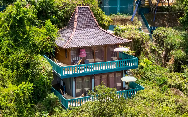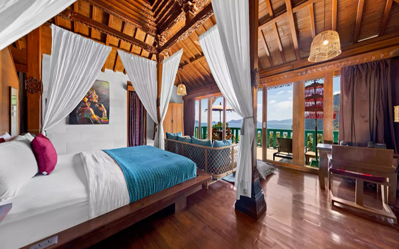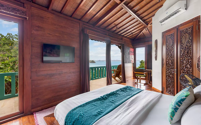 Set atop the studios, the Joglo Deluxe villas present an elegant blend of Indonesian architectural elements and local design, with reclaimed teak, artisanal woodwork, and tumpang sari roof accents that echo Bali. A wrap-around balcony faces out to sweeping sea views through floor-to-ceiling glass, offering a seamless connection between interior comfort and the natural panorama.
