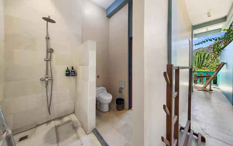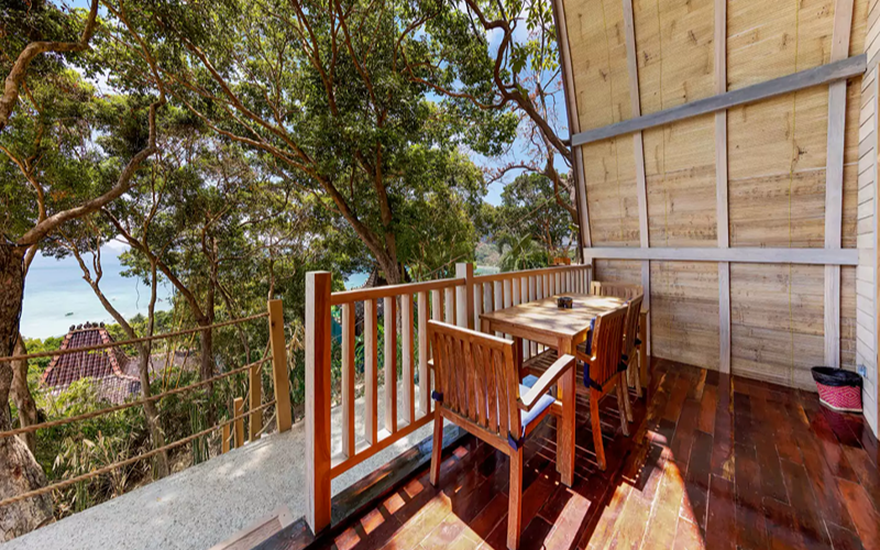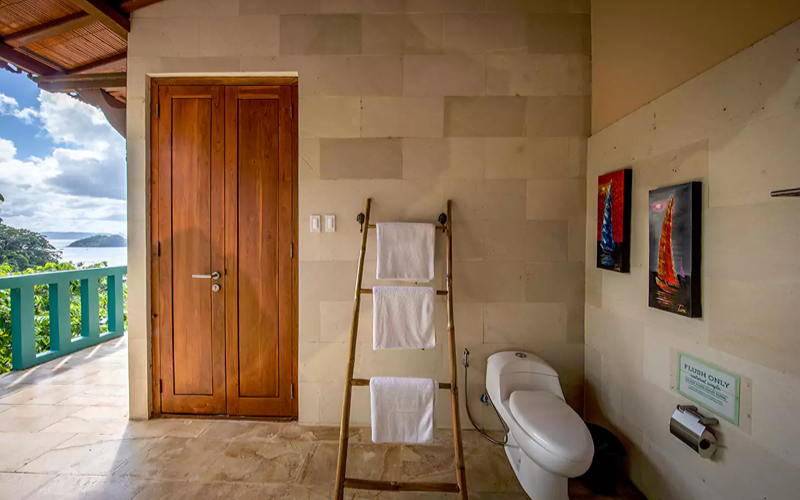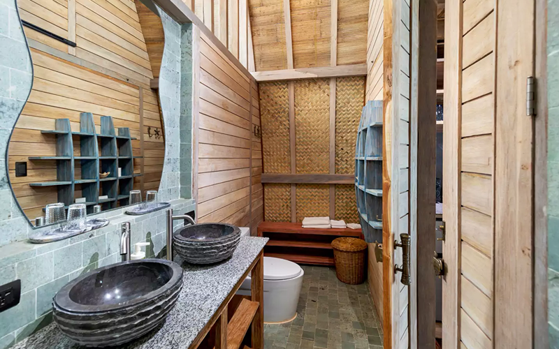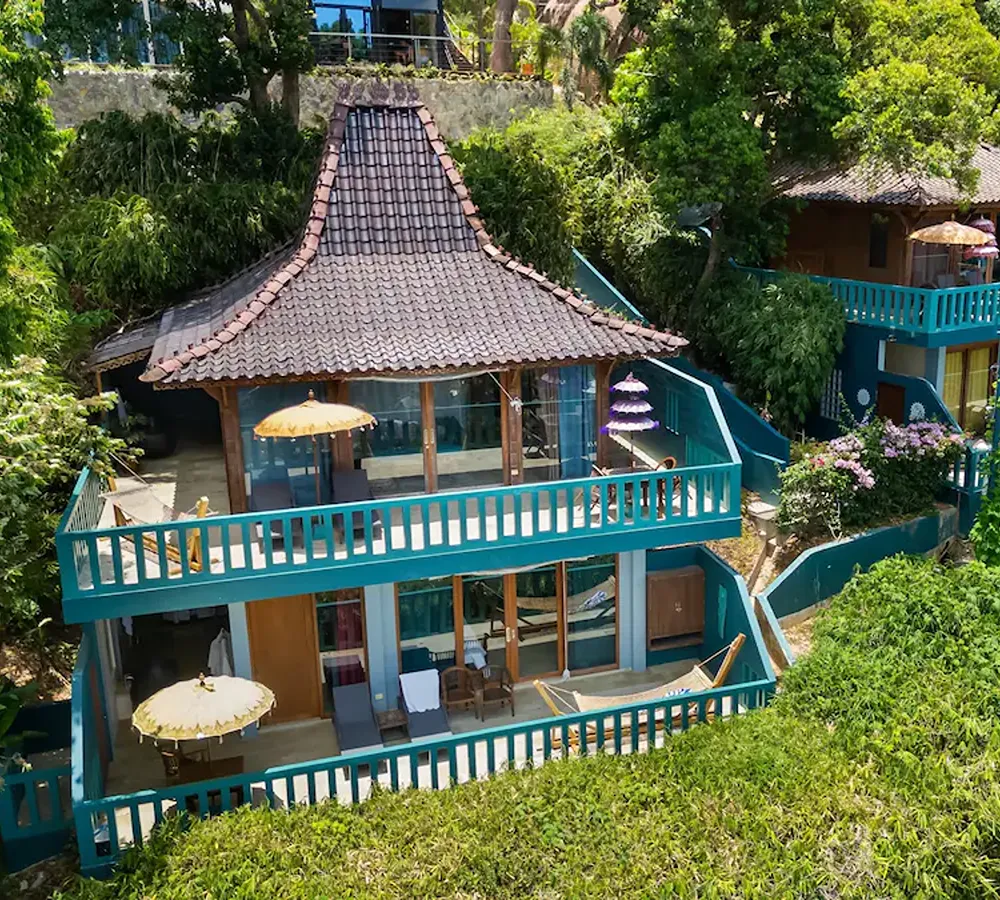 Studio Family Seaview offers a cozy yet spacious two-story low-rise layout tucked just below the Joglo villas, designed for families or small groups seeking both comfort and beauty. Through floor-to-ceiling sliding glass doors, the unit opens to a private balcony with sun loungers, hammock, and dining table—perfect for enjoying sea views, sunsets, or the fresh island air. The interiors are richly appointed with wood and stone finishes, Asian-style carvings and artworks from the Philippines, Indonesia, and Thailand, and luxury touches like marble sinks and Javanese stone flooring.