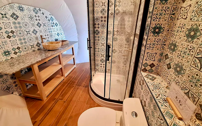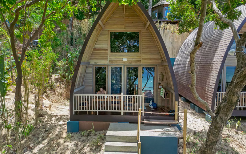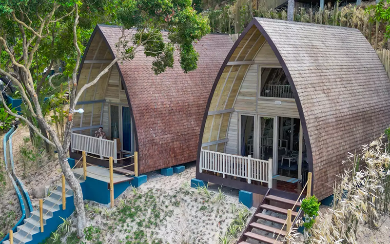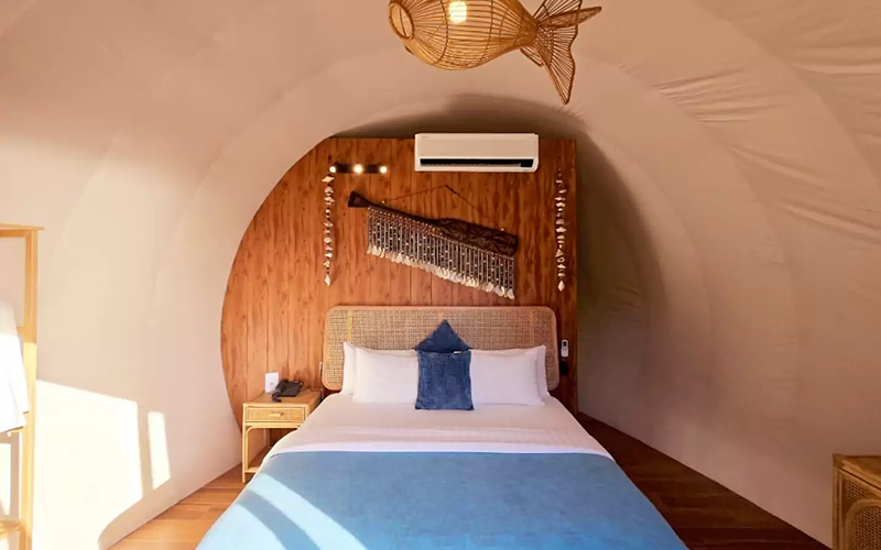 The Shell glamping unit is uniquely shaped like a seashell and sits above the reception and apartment buildings, taking full advantage of the hillside elevation. Its ~ 20 sqm interior is supplemented by ~ 10 sqm of open lounge deck, enabling guests to enjoy morning breezes or sunset vistas while perched over the ocean.