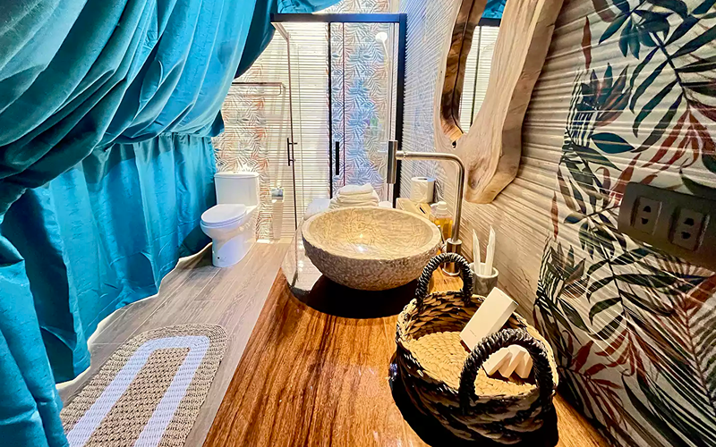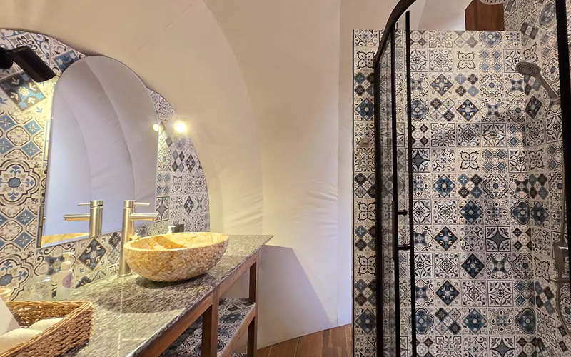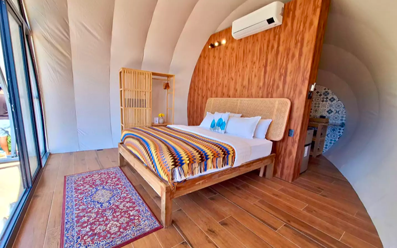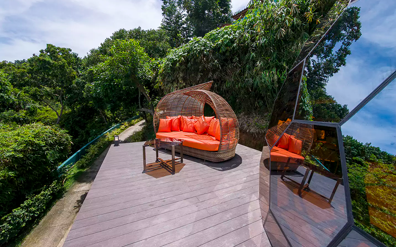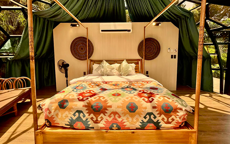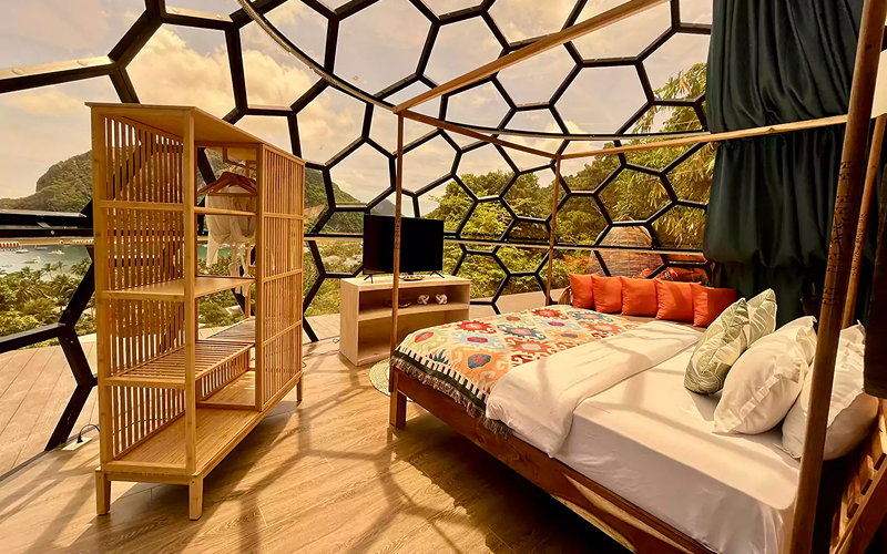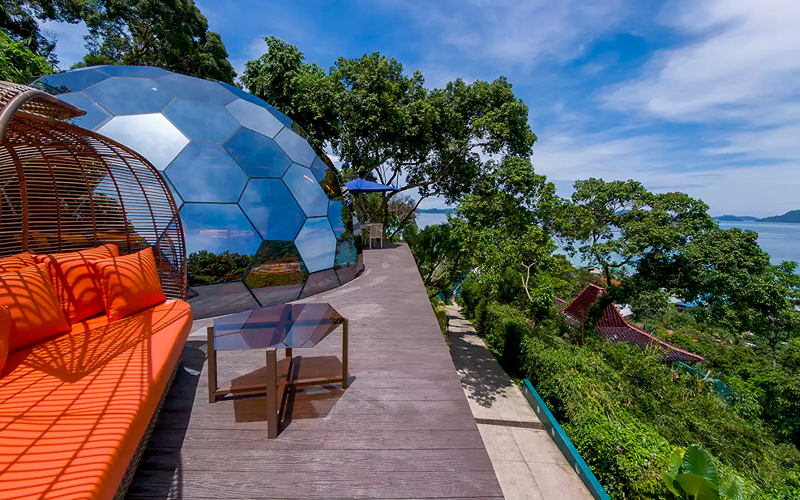 Perched near the spa and infinity pool area, the Stargazer dome is Karuna’s standout glamping concept. Its glass dome architecture and curved design allow a 360° skyward and ocean horizon view — daylight and starlight alike become part of the experience.