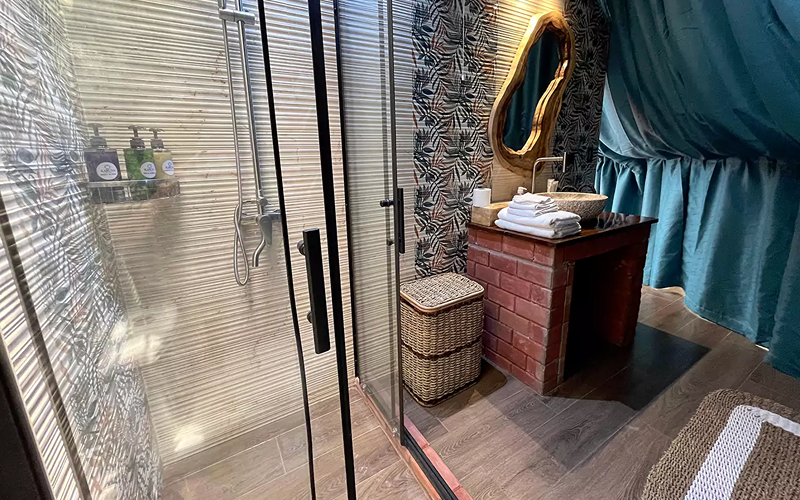Inside, the layout is warm and flexible—ideal for couples or small groups. The king bed anchors the room, while a king-size sofa bed (convertible to a full king) and an optional single bed allow for extra guests. The thoughtful accent lighting, high ceilings, and natural materials create an intimate yet airy space that complements the resort’s hillside ambiance.