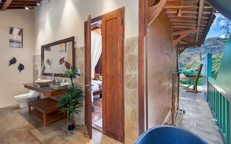 Studio Deluxe Seaview offers a peaceful two-story low-rise setting just below the Joglo villas. Its layout features a generous balcony (with sun loungers, hammock, outdoor table), blending the outdoors with the plush interior. The craftsmanship shows off wood, stone, and high-end finishes (stone flooring, marble sink/countertops, floor-to-ceiling glass doors) that let in light and views.