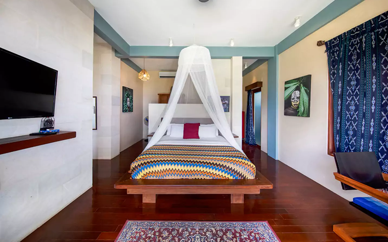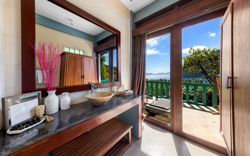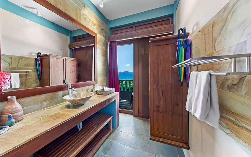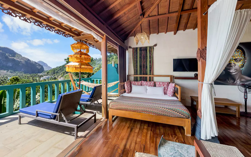 Studio Premier Seaview combines modern suite ambiance with spacious comfort, nestled in a two-story low-rise building just below the Joglo villas. The unit features its own private balcony furnished with sun loungers, a hammock, and a dining area — perfect for unwinding while enjoying sunsets or sea breezes. Interiors are richly detailed, with Asian-style wood carvings and paintings from the Philippines, Indonesia, and Thailand; finishes include Javanese stone and hardwood floors, marble sinks and countertops, and full-height sliding glass doors that invite in light and the view.
