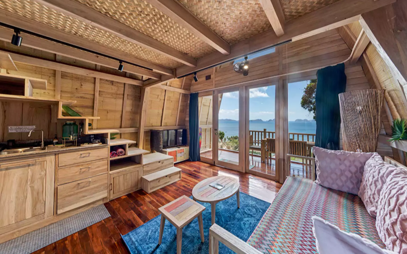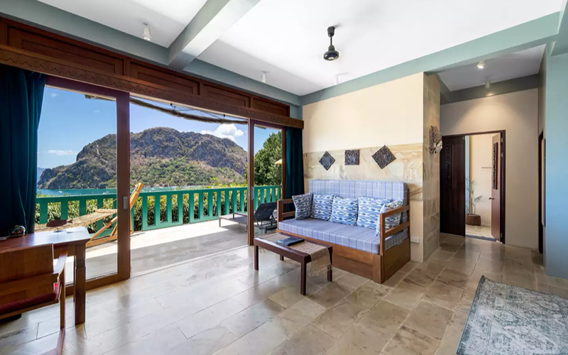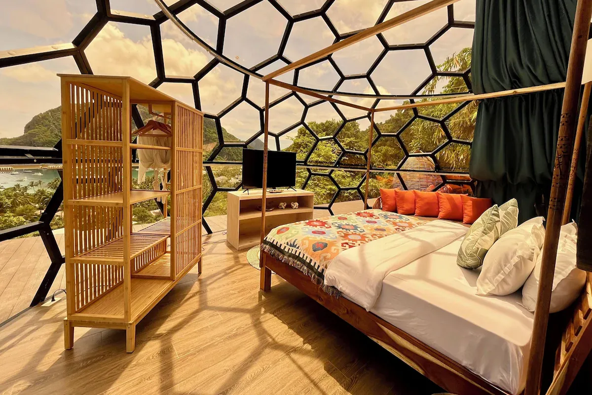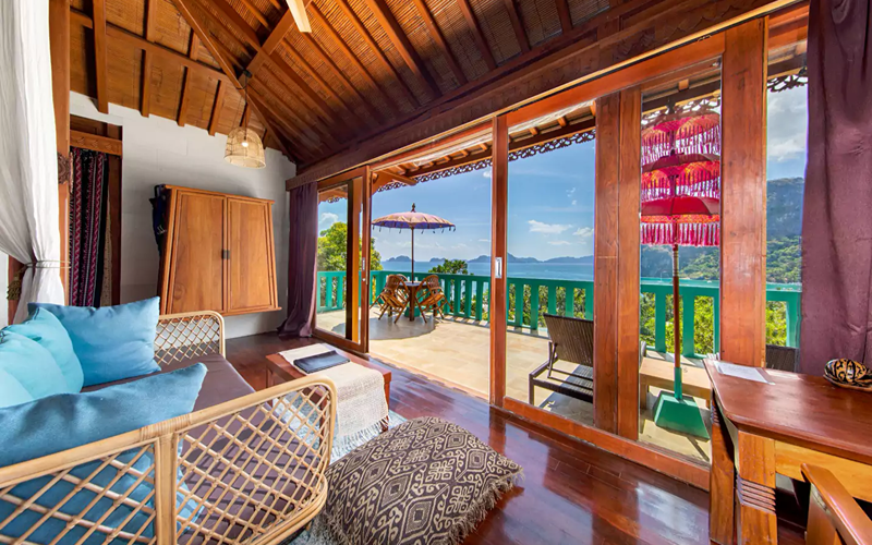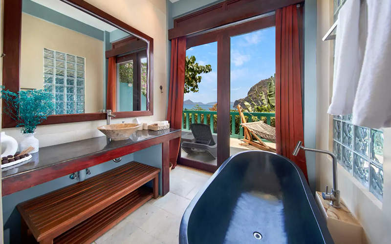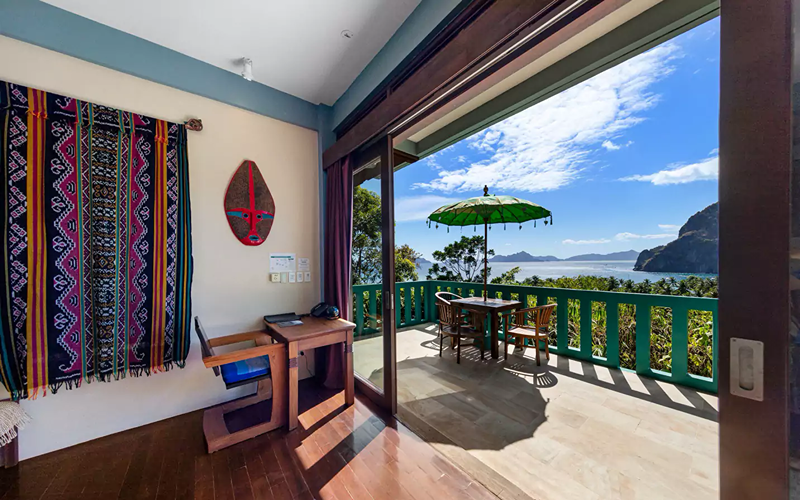 Inside, modern comforts merge with boho flair: a king bed, air conditioning, smart TV, WiFi, minibar (surcharge), and an ensuite with marble sink and shower. The dramatic window front frames the stunning Bacuit Bay panorama, turning the unit itself into a viewing gallery that immerses you in both architecture and nature.
