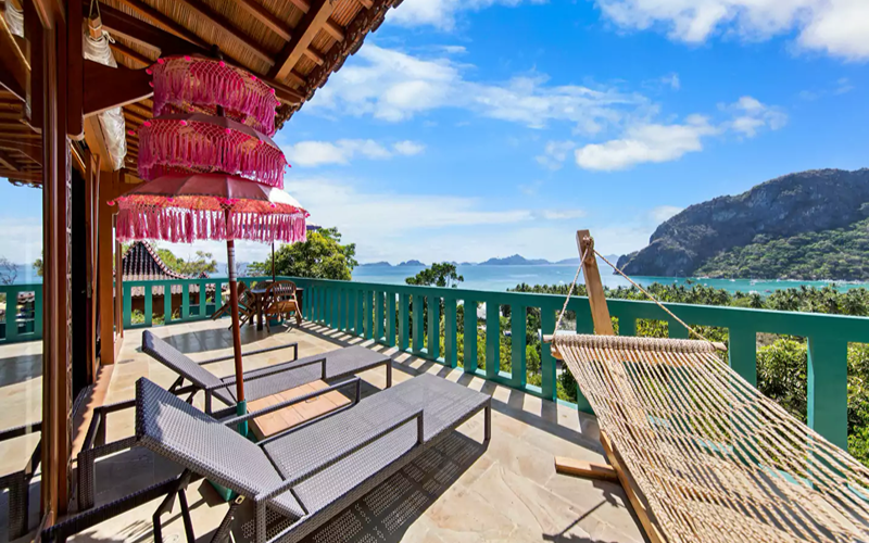 This villa sits high on the slope, offering sweeping and unobstructed vistas of Bacuit Bay that stretch from morning light through to sunset. Inside, the design merges traditional Balinese and Indonesian craftsmanship — high ceilings, intricate woodwork, a Tumpang Sari (decorative roof structure), solid acacia dining table, natural stone and wood finishes — all accented with luxurious touches.