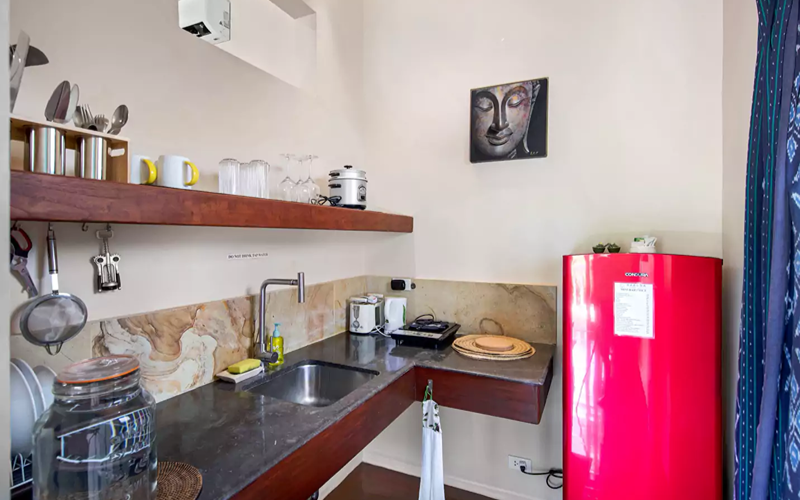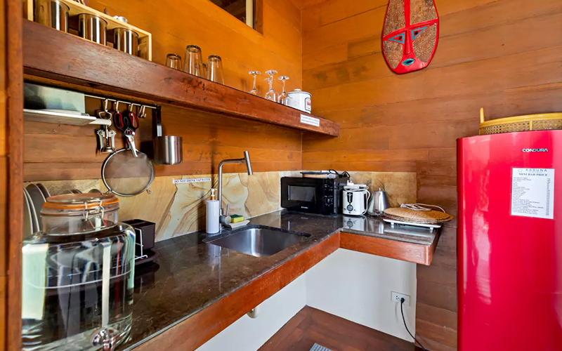 The layout provides flexibility: the king bed ensures restful nights for two, while the sofa bed (convertible to full king) plus an optional single bed make it possible to comfortably accommodate up to five guests. Thoughtful amenities—air conditioning, kitchenette, blackout and Bali-style curtains—wrap guests in luxury, while the location on the hillside lets you feel immersed in nature yet still connected to resort life.